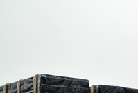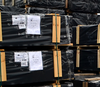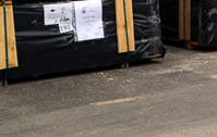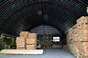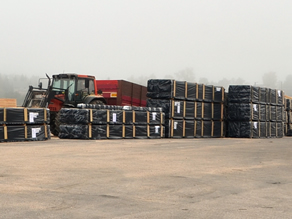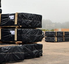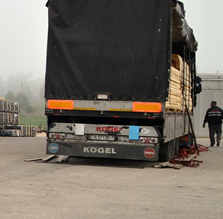 Palettes de chalets prêts à voyager - Camion en cours de déchargement de bois brut de coupe destiné au séchoir, de grande taille.