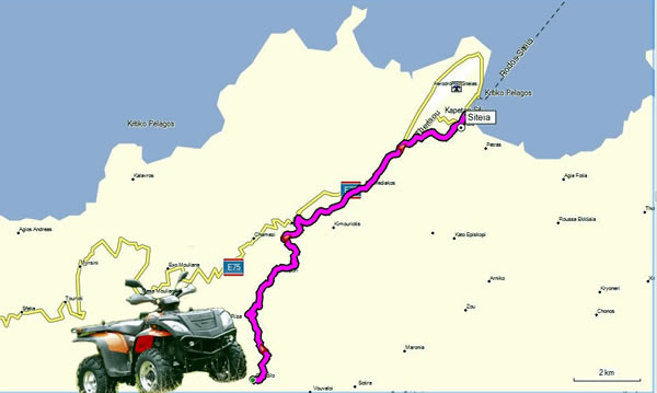 ![]() Sur la piste dite "ancienne route nationale" venant de Sitia et la route qui descend vers Mochlos, on retourne à la taverne Bogazi en face de l'îlot qui reliait la côte avant d'affronter les sommets, vertiges garantis à cause du quad bien sûr, aucune confiance dans ses capacités à affronter le terrain. Il va quand même avaler les 971m de dénivelé, non mais, qui c'est le pilote ? |