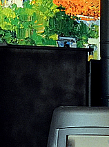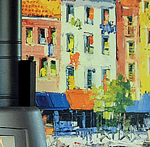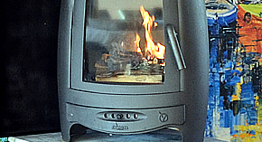 | En face du poêle équipé de sa "protection hivernale" (panneau de récupération chaleur et renvoi dans la pièce de vie) Fabrication maison |