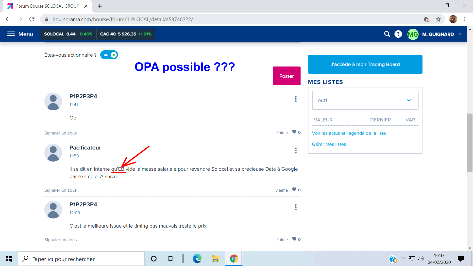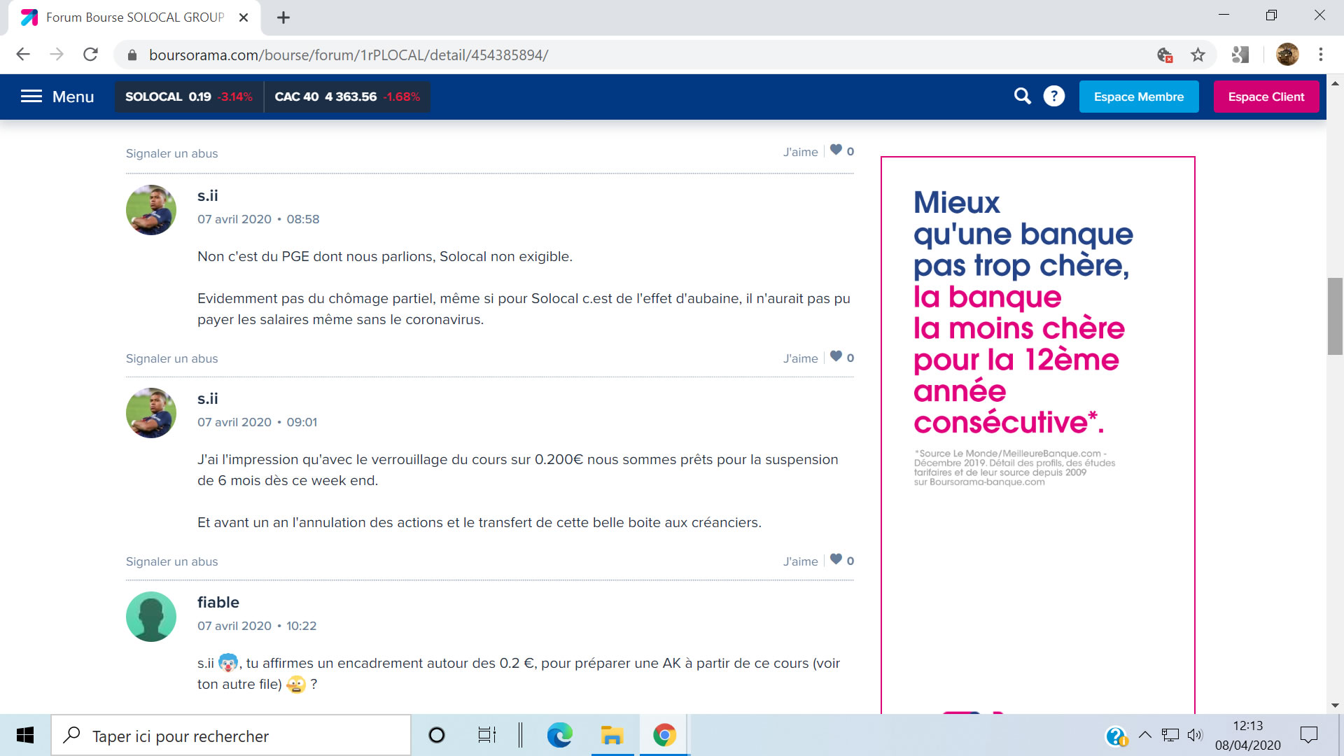 | 14/04/2020 | Qu'en sera-t'il pour SOLOCAL ? A propos du PGE | 21/04/2020 | Difficile pour moi de communiquer directement en période fermée. |