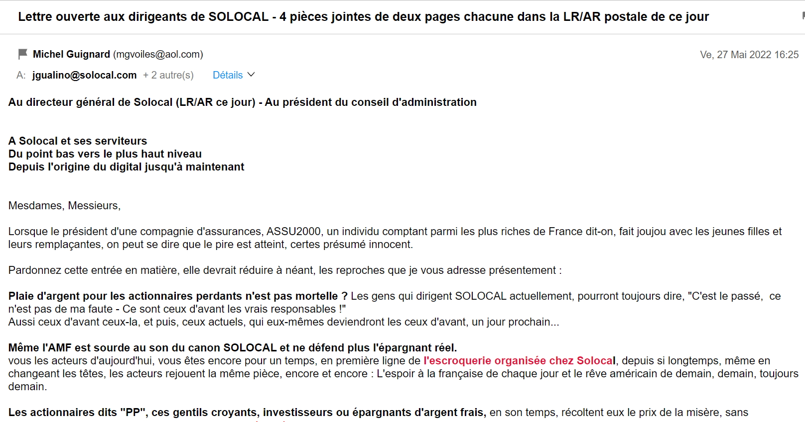 lettre ouverte (ci-dessus) envoyée en LR/AR reçu le 30 Mai 2022