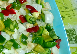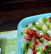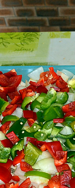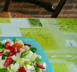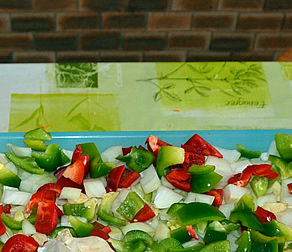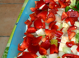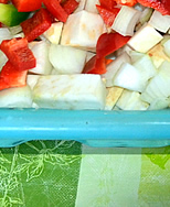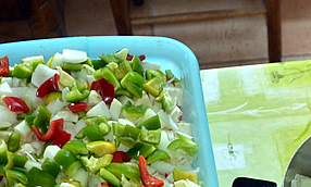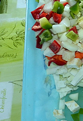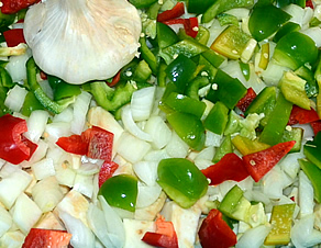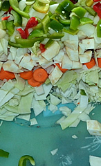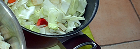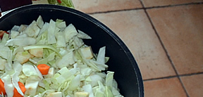 Etape 1 - Les légumes sont coupés, choux, céléris, carottes, gousses d'ail, oignons, poivrons,